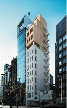 高さ約56メートル、銀座髙木ビルの9階から最上階12階部分は、鉄筋コンクリートのビル群の中で浮かぶように見える“木の箱”。東京・多摩地域で生育し、その地区で生産・認証された木材「多摩産材」のスギ材を使用した木造建築です。