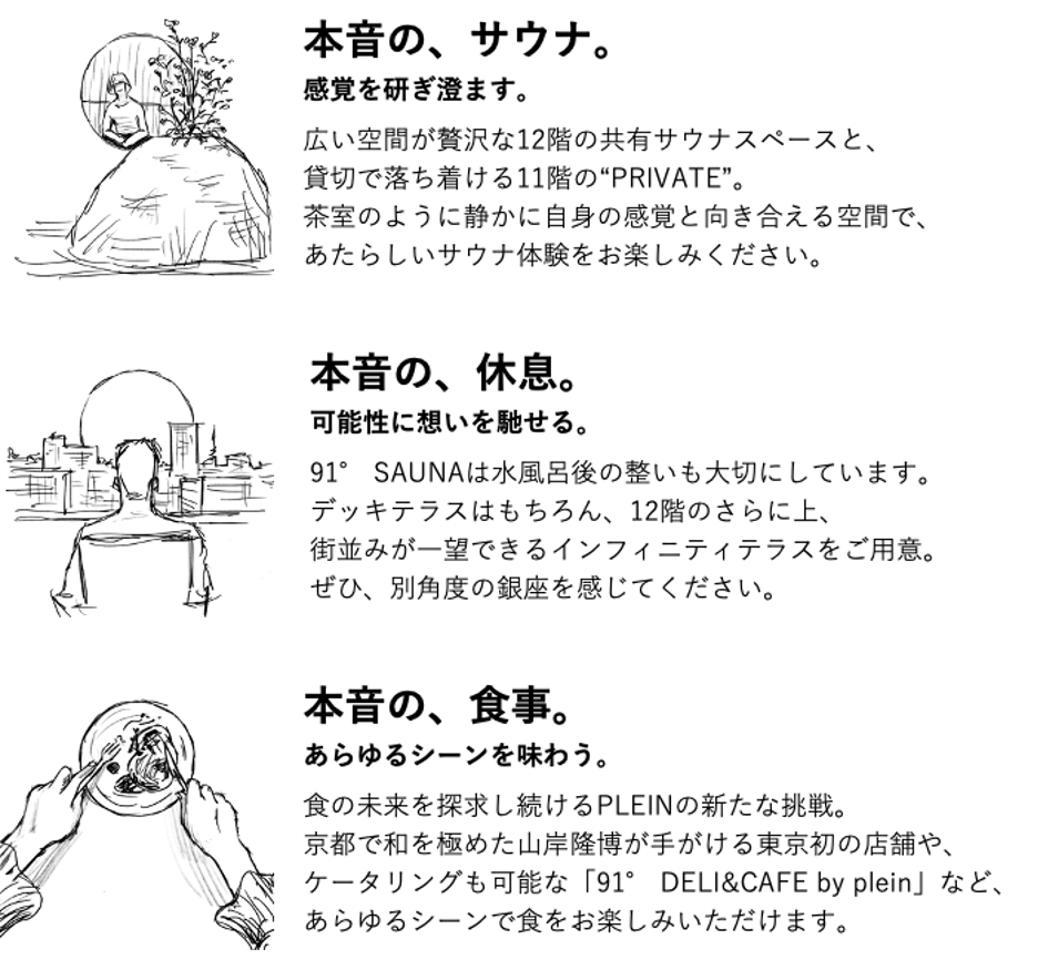 銀座の街並みを一望できるサウナ施設「91° SAUNA銀座」をはじめ、京都で和を極めた山岸隆博が手がける東京初の店舗や、ケータリングも可能な「91° DELI&CAFE by plein」などから成る「SALON 91°」が2023年9月下旬より順次オープンします。