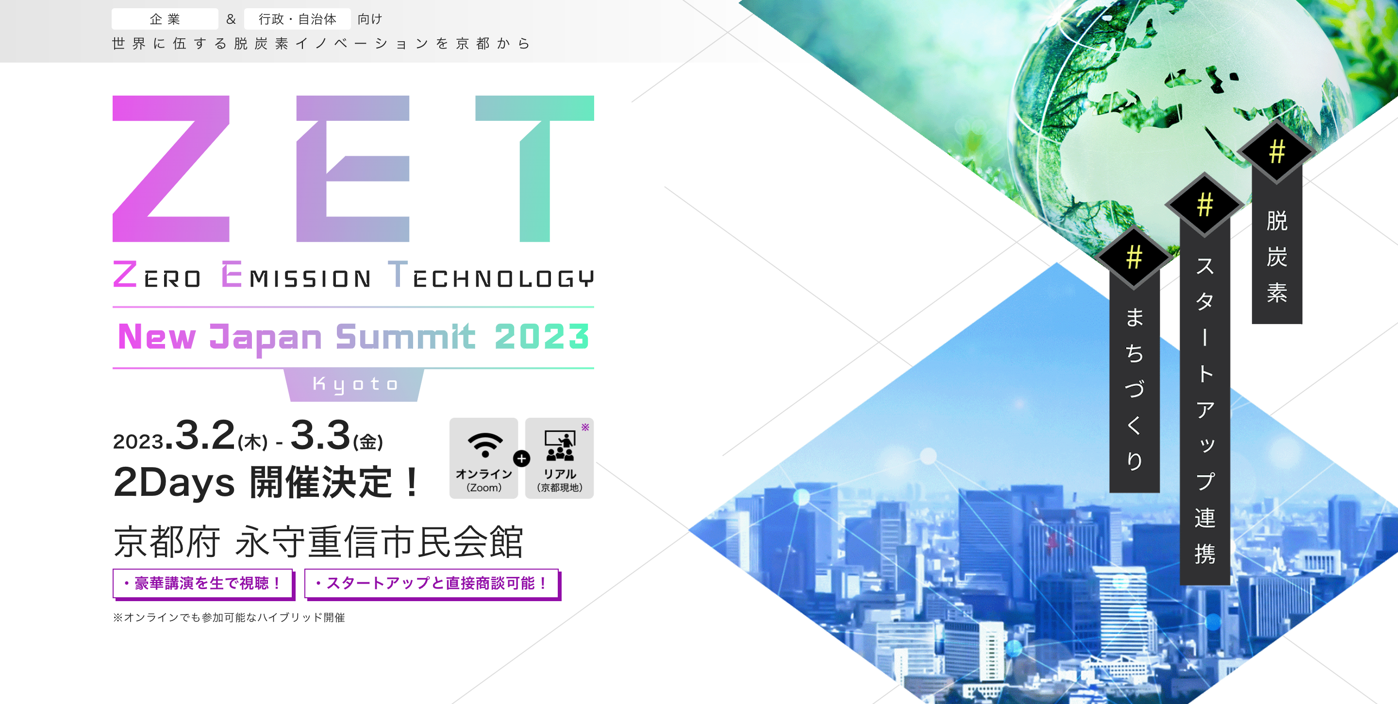 国内外の脱炭素テクノロジー(ZET:Zero Emission Technology)関連スタートアップ等との協業、まちづくり・地域産業への技術導入をテーマに、産学公の関係者が一堂に会し事例の共有を図り、新たな交流と共創が生まれる場として開催。「石油から空気へ、地方が最先端へ、制約から拡張へ」をコンセプトに、「ゼロカーボンものづくりによるゼロカーボンまちづくり(地産地消型社会への転換)」を目指した「ZET-valley構想 」を推進する京都府と、グローバルオープンイノベーションを推進するTECHBLITZの「New Japan Summit」の共同企画イベントです。
