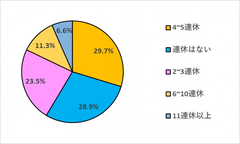 「今年のGWは何連休予定ですか?」という質問に対し、「4~5連休」が29.7%、次いで「連休はない」が28.9%、「2~3連休」が23.5%という順になりました。4~5連休の人が多いようですが、連休はない人も同じ位いらっしゃることが分かりました。