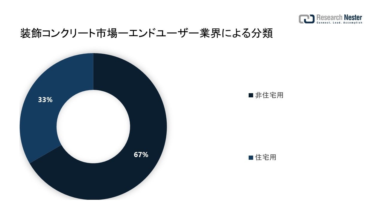 世界の装飾用コンクリート市場は、エンドユーザー業界による需要と供給について、住宅用と非住宅用に分割および分析されています。そのうち、非住宅セグメントは 2035 年末までに最高の収益を獲得すると予想されています。このセグメントの成長は、非住宅建設活動への支出の増加に起因する可能性があります。米国では、非住宅建築への支出は 2022 年に約 4% 増加し、2023 年にはさらに約 5% に増加すると予想されていました。また、非住宅構造物におけるフローリング用装飾コンクリートの需要の高まりは、セグメントの収益成長を促進すると予想されます。また、駐車場、商業店舗、プールデッキの表面に滑り止めを提供するために化粧コンクリートの使用が増加した結果、このセグメントの収益が増加すると予想されます。