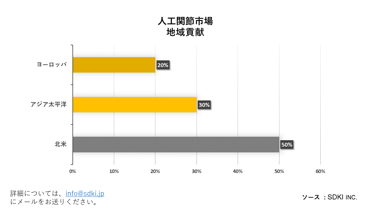 世界銀行のデータによると、日本では人工関節の市場が順調に伸びています。日本は、65 歳以上の人口の割合が世界で 2 番目に高い国です。人口の高齢化と非常に活動的な人々の増加は、関節置換術の増加に大きく貢献しています。日本の整形外科用大型関節再建装置の収益は、2022 年に 30 億米ドルを超えました。さらに、韓国の医療用ロボット企業 Curexo は、京セラ株式会社と提携して人工関節手術用ロボットの日本市場に参入しました。