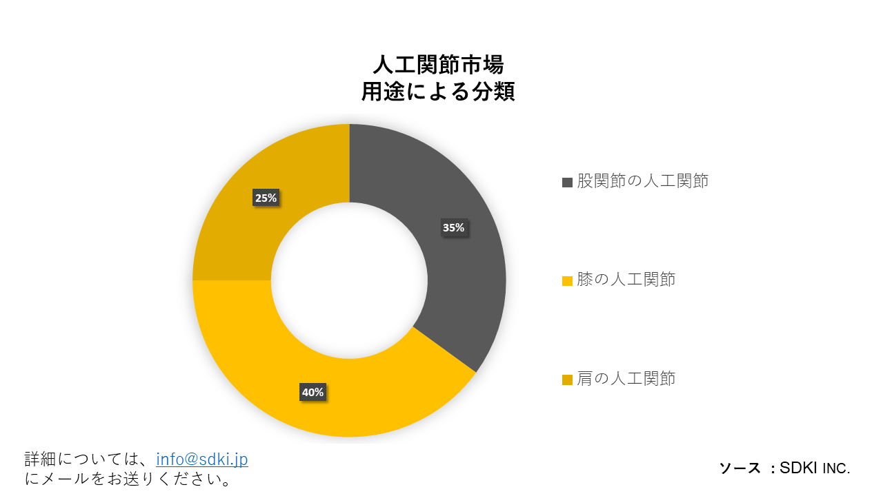 - 用途別には、市場は膝の人工関節、股関節の人工関節、肩の人工関節などに分類されます。