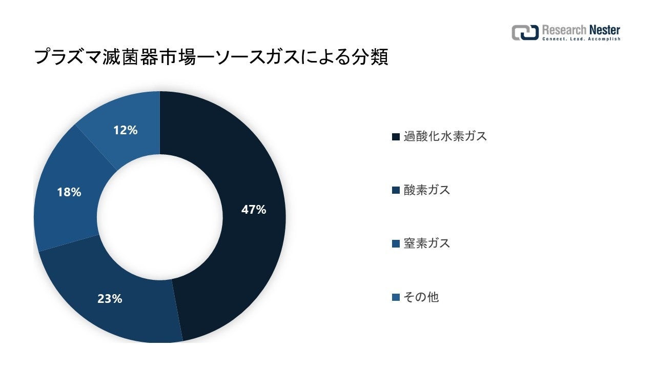 世界のプラズマ滅菌器市場は、過酸化水素ガス、酸素ガス、窒素ガスなどにソースガス別に需要と供給について分割および分析されています。セグメントの種類のうち、過酸化水素ガスセグメントは、予測された時間枠で最大の市場シェアを獲得すると推定されています。世界中での過酸化水素ガスの取引の増加は、予測期間中にセグメントの成長を促進すると予想されます。国際貿易センター (Trademap) のレポートによると、2021 年の過酸化水素ガスの輸出額は、2019 年の 735,011 千米ドルから世界中で 864,800 千米ドルに増加しました。