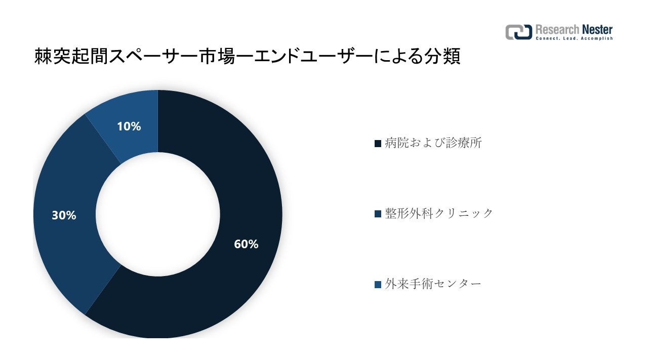 適応に基づいて、これらのうち、腰部脊柱管狭窄症のセグメントは、世界中で腰部脊柱管狭窄症の症例が増加していることにより、最大のシェアを占めると予測されています。最近の報告によると、米国では約 200,000 人の成人が腰部脊柱管狭窄症の影響を受けており、かなりの痛みと身体障害を引き起こしています。さらに、患者による低侵襲手術の要求の高まりは、セグメントの成長に有益な機会をもたらすと予想されます。また、脊椎疾患の増加により脊椎手術が増加し、治療中の棘突起間スペーサーの需要が再び高まっています。