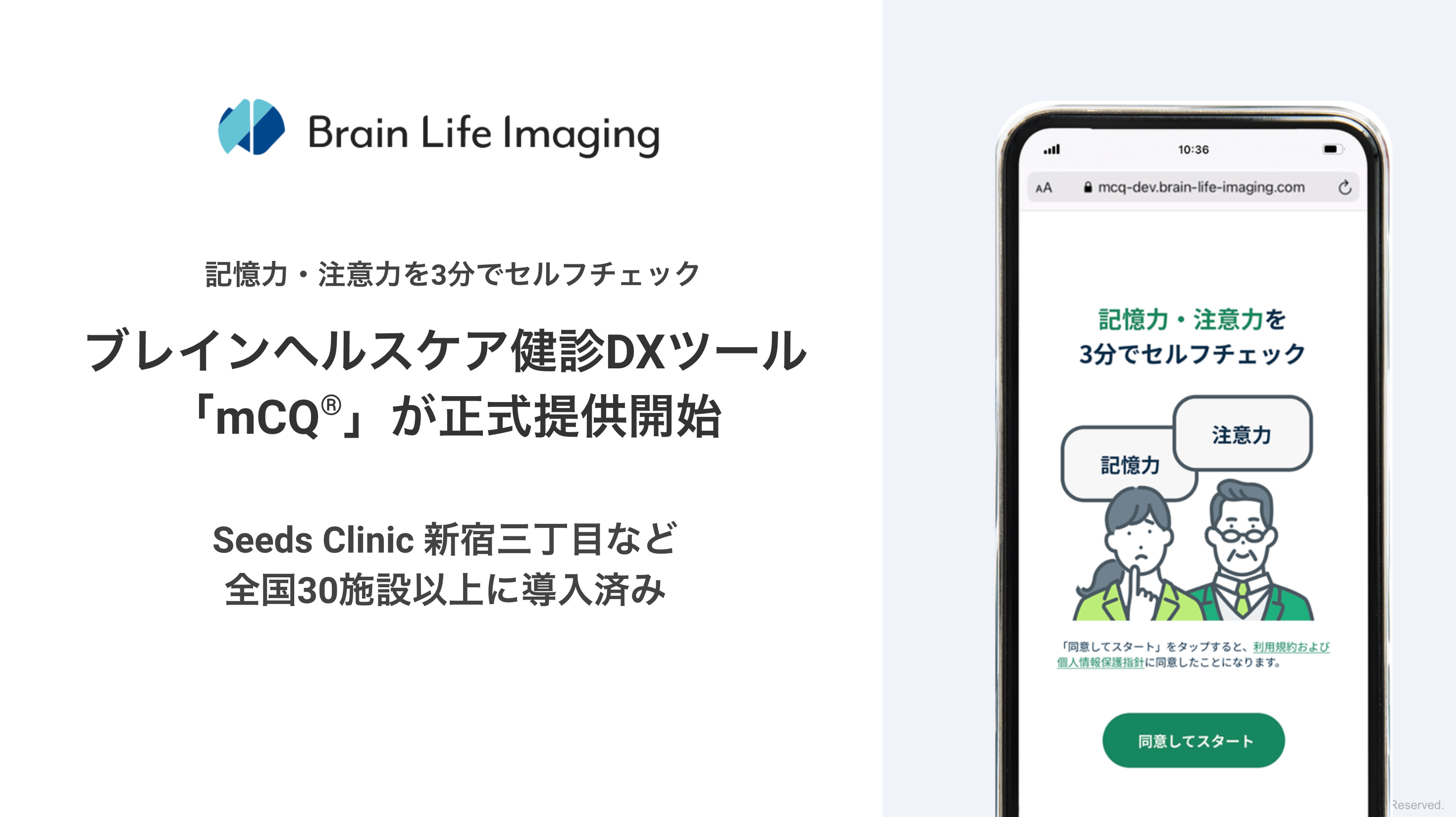 このたび提供開始する「mCQ®」は、記憶力・注意力を3分でチェックするブレインヘルスケア健診DXツールです。病院やクリニックの待合室などで自身のスマートフォンで気軽に操作し、簡易的に記憶力と注意力のチェックを行うことが可能となります。2021年5月よりβ版の提供を開始し、正式提供開始時点で全国30施設を超える病院やクリニックに導入されております。