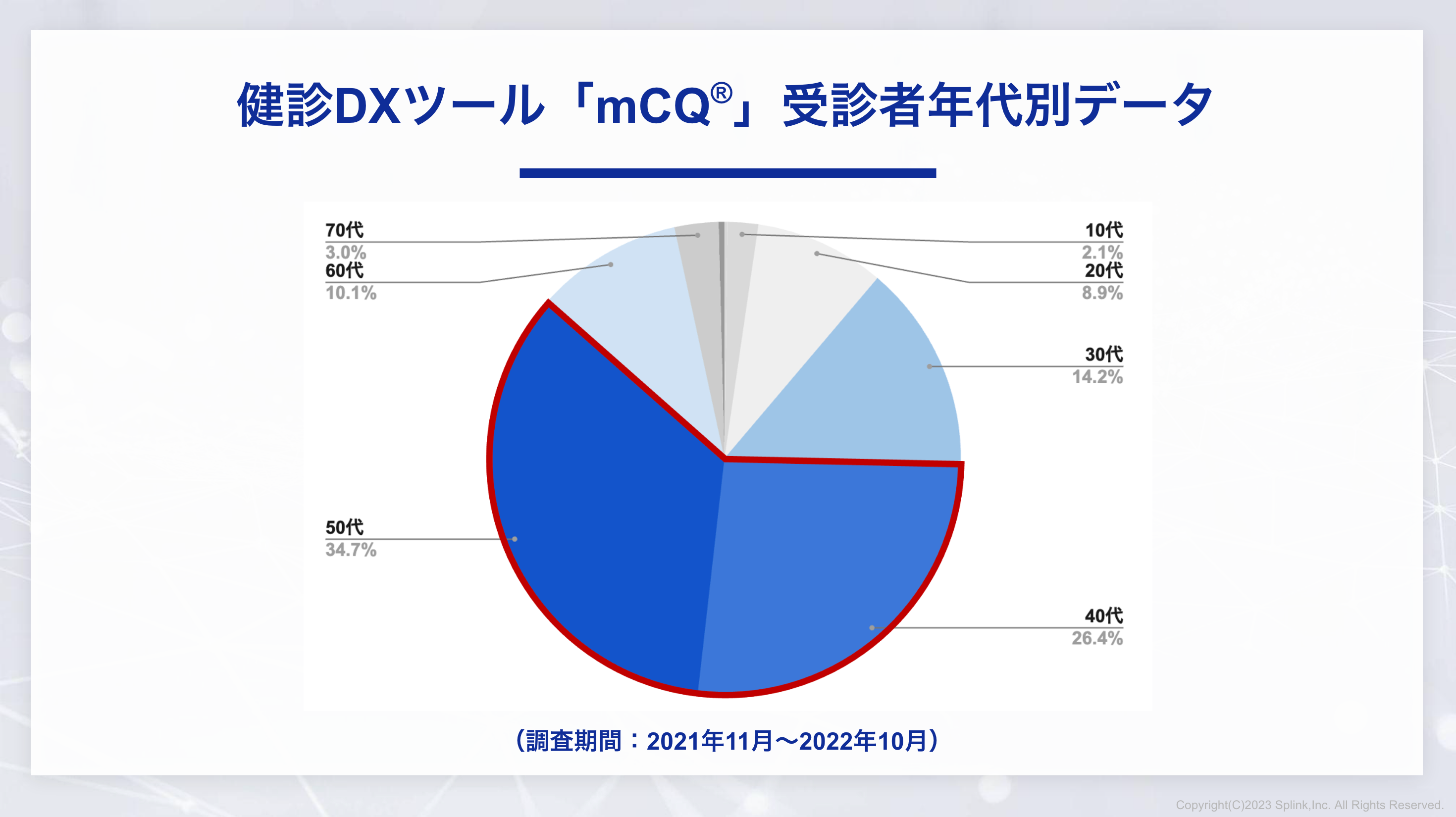 共同で実証実験をおこなった医療法人永仁会 Seeds Clinic 新宿三丁目(所在地:東京都新宿区、院長:石田 二郎)での受診者データによると、「mCQ®」受診者の約6割(61.1%)が40代・50代で占めており、ブレインヘルスケア(脳の健康)を意識し始める年代の利用者が多いことが判明。さらに、脳ドックの受診を促すことが示されました。