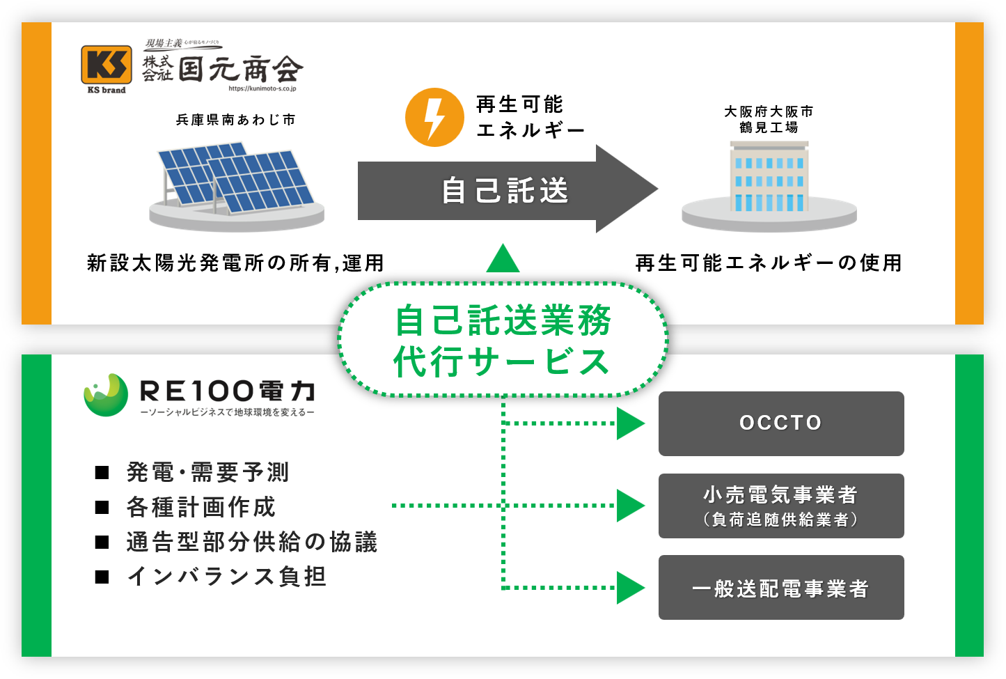 当サービスは、RE100電力がアグリゲーターとして送配電事業者や負荷追随供給事業者との協議、発電予測、計画提出業務まで国元商会の自己託送*2に必要な業務を代行、サポートするものです。本取り組みにより、国元商会が新規開発した太陽光発電所(兵庫県南あわじ市)にて発電された電力を、約100km離れた鶴見工場(大阪府大阪市)が使用する電力の一部として自己託送を行うことで、国元商会は年間約220,000kWhの再生可能エネルギーの直接調達を実現、電気料金の削減および調達電力の長期安定化を推進します。