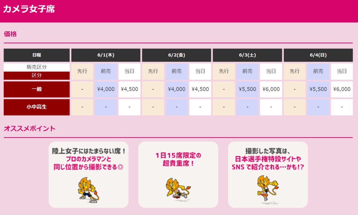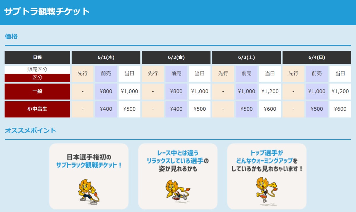 今年はスペシャルチケットとして、テーブル・コンセント付きの最上位グレード席となる「SS席」のほか、1日50席限定の「B席アスリート交流チケット」、1日15席限定の「カメラ女子席」、そして日本選手権では初めてサブトラックの観戦ができる「サブトラック観戦チケット」の販売をいたします。席数限定の販売となりますので、是非お早めにお買い求めください!