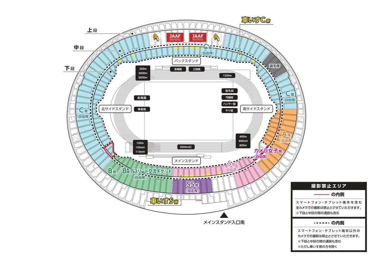 陸上競技はグラウンドレベルの様々な場所でレース・試技を行うため、C席にも移動可能としています。