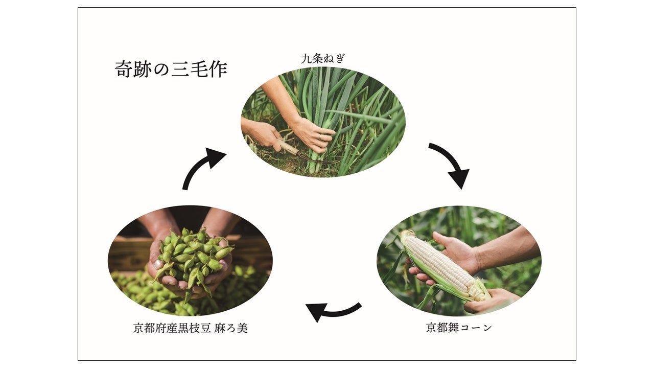 「奇跡の三毛作」とは、九条ねぎ・京都舞コーン・麻ろ美(黒枝豆)から成る弊社オリジナルの三毛作のことを指し、この土壌の循環が品質を担保する重要な鍵になるのである。つまり、年間を通しての生産計画をこの度見直し、現場に落とし込んだのだ。