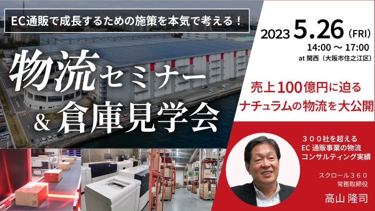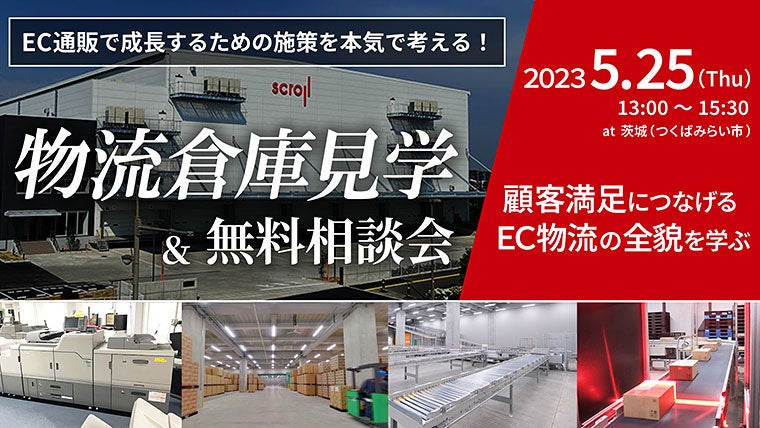 株式会社スクロール360(本社:静岡県浜松市中区、取締役社長 西田 耕三)は、2023年5月25日(木)・26日(金)に、関東(茨城県つくばみらい市)と関西(大阪府大阪市)の2拠点にて「物流倉庫見学会」を無料開催いたします。