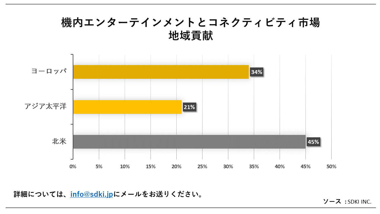 北米地域の市場が2035年末に最大のシェアを占めると予想されています。この地域には、世界最大の市場参入企業が多く存在し、この地域の成長を促進すると予想されます。Gogo LLC、Panasonic Avionics Corporation、Collins Aerospace などの主要な市場プレーヤーは、米国に拠点を置いています。ユナイテッド航空株式会社とデルタ航空株式会社など、地域の有名な航空会社の中には、Wi-Fiとタブレットを利用して乗客に補償資料を提供する取り組みを継続して行っているところもあります。さらに、BYODの普及により、航空会社は後部座席にスクリーンを設置する必要がなくなり、航空機全体の重量を軽減できる可能性があります。調査の結果、乗客の45%が機内エンターテイメントにデバイスを使用することを好み、シートバックのスクリーン下部を好むのは27%に過ぎないことが判明しました。