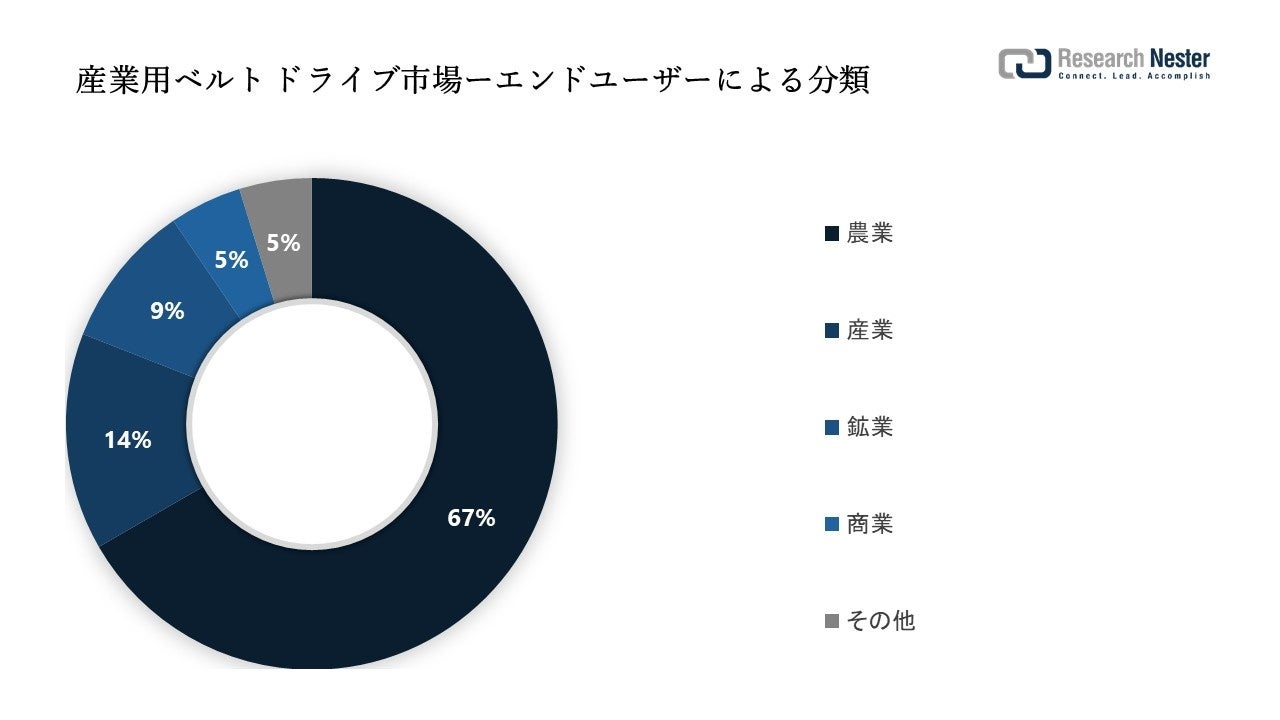 市場はまた、産業、鉱業、農業、商業などのエンドユーザーによる需要と供給についてセグメント化および分析されています。これら 5 つのセグメントの中で、農業セグメントは 2035 年に大きなシェアを獲得すると予想されます。ベルト ドライブは、さまざまな農業用途で使用できます。たとえば、灌漑、耕うん、散布、収穫などの活動に利用される機械や設備に組み込まれています。また、穀物、飼料、その他の農産物を取り扱うコンベヤシステムにも使用されています。その結果、今後数年間でこのセグメントの成長のための多くの機会が生まれると予想されます。