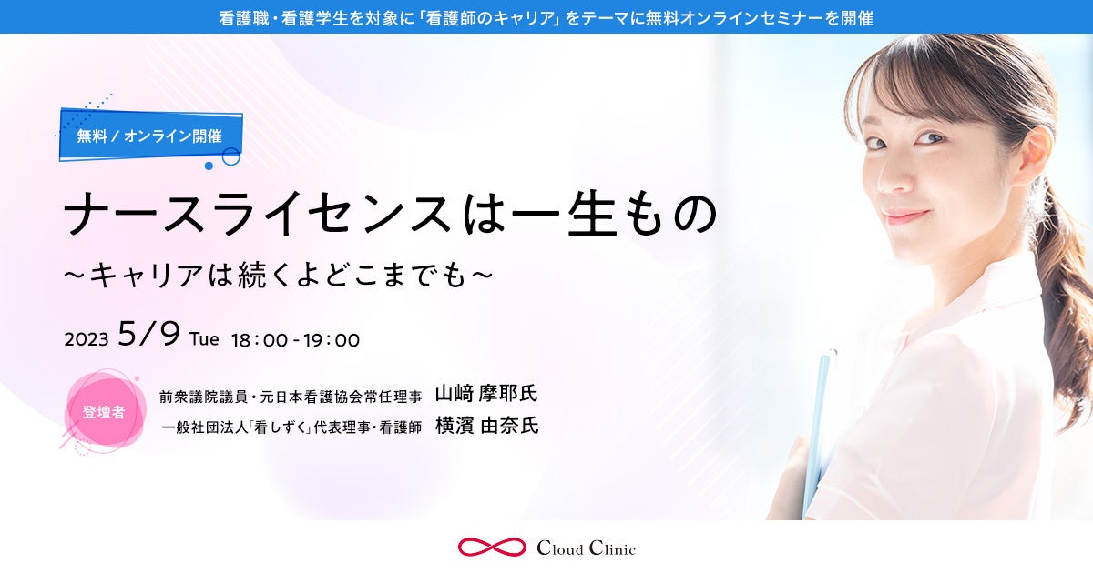 【タイムスケジュール】 ・18:00-18:20 前衆議院議員・元日本看護協会常任理事 山﨑 摩耶氏 「潜在看護師の課題と取り組み」 ・18:20-18:40 一般社団法人「看しずく」代表理事・看護師 横濱 由奈氏 「看護しずくで実践している『キャリアを止めない働き方』」 ・18:40-19:00 トークセッション・質疑応答 ファシリテーター:株式会社クラウドクリニック 三浦あかね(看護師) |