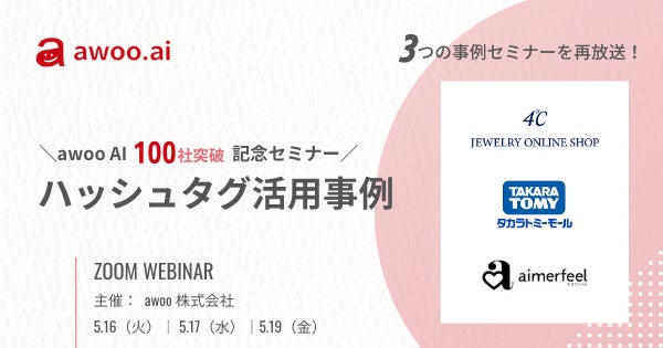 ECハッシュタグ自動生成ツール「awoo AI」は、2023年4月をもちまして、日本国内での導入企業数が100社を突破しました。これを記念し、過去に実施した「awoo AI」の活用事例セミナー3つを再放送します。