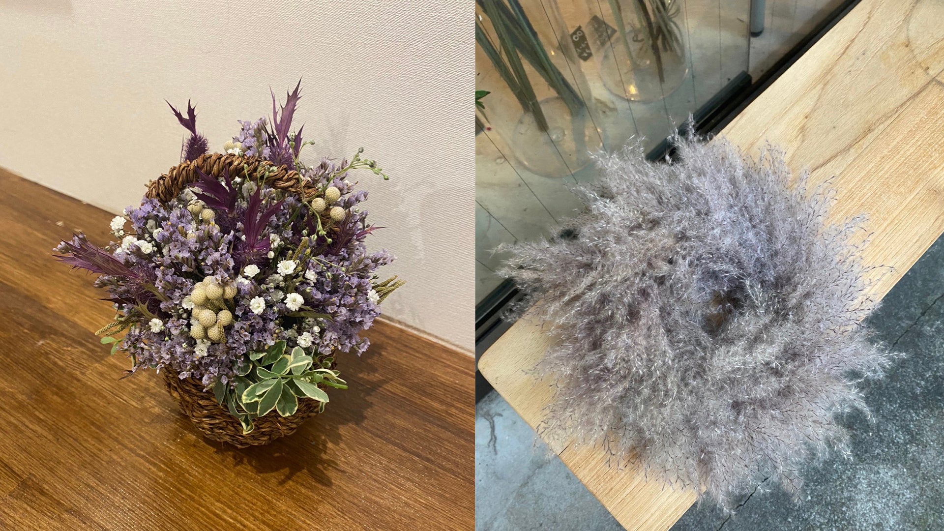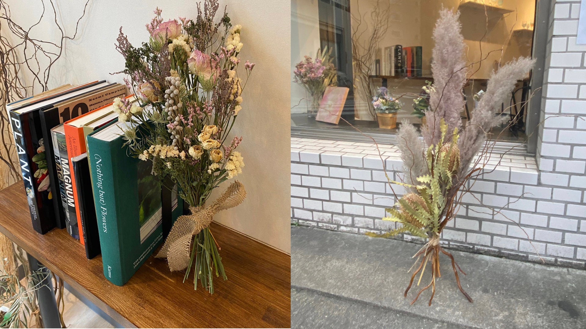 左から「dry flower bouquet」「pampas grass & Banksia object」