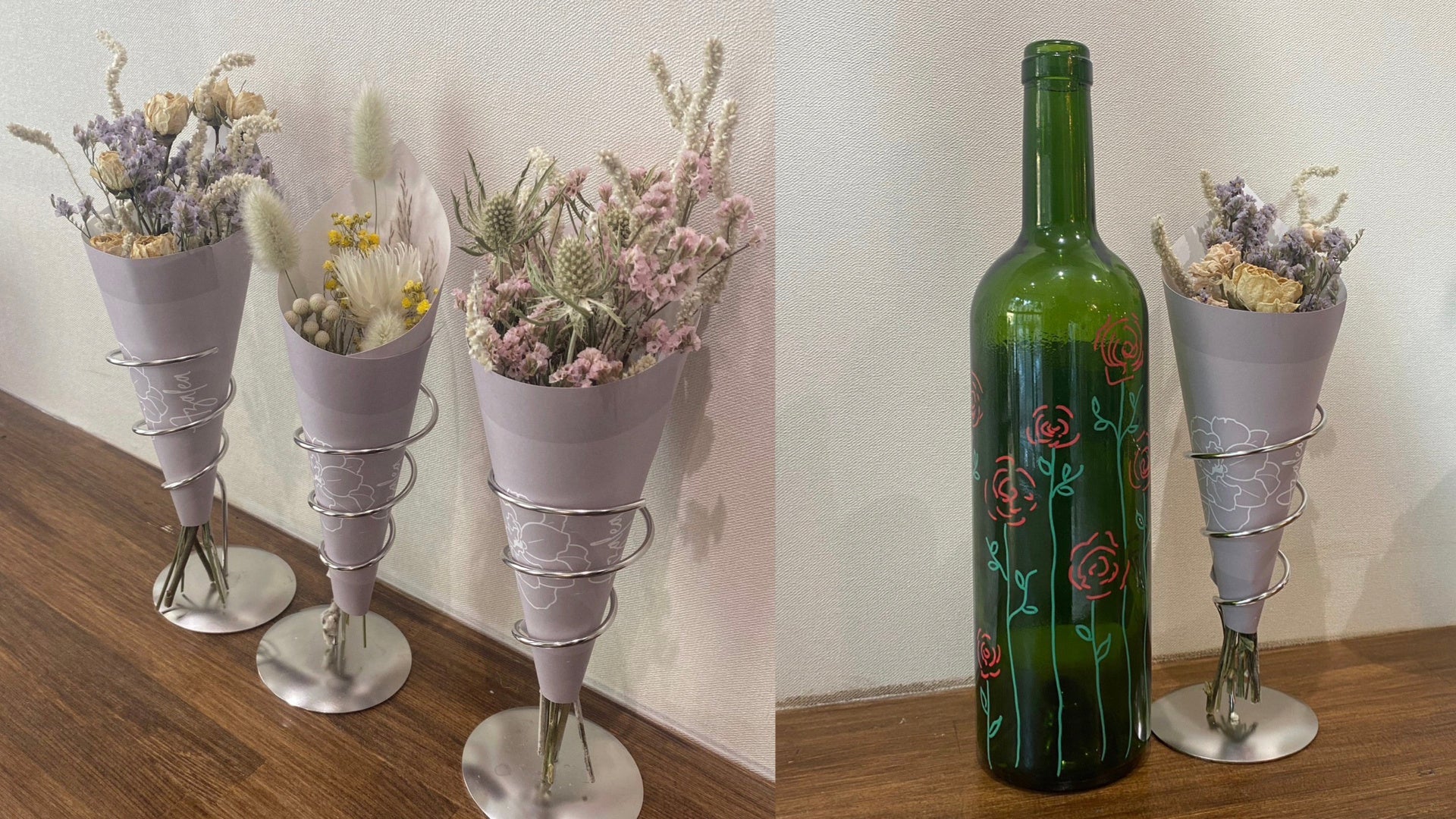 当店では、ワインの空きボトルを花瓶として有効活用していただきたく、デザインを施したボトルを展示しております。