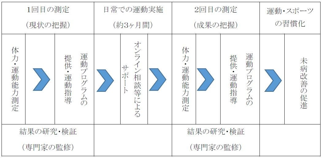 体力や運動能力を測定し、その結果を基に個別の運動プログラムを作成します。3ヶ月間運動を継続した後、2回目の計測を行い、どのような変化が起きるか…。現状と課題、その成果を把握し、運動の習慣化を目指しましょう。3ヶ月の間にはオンライン相談によるサポートも受けることができます。