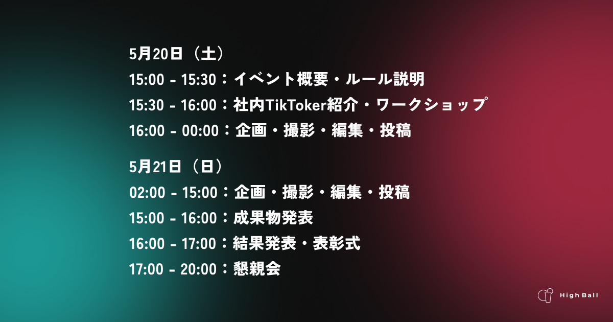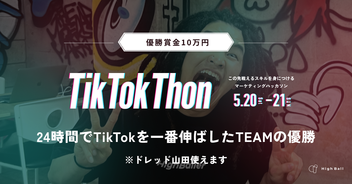 株式会社ハイボール(本社:東京都渋谷区、代表取締役:大田卓矢)は、2023年5月20日(土)から5月21日(日)にかけて、総フォロワー150万人のHighBall広報「ドレッド山田」(https://www.youtube.com/@dreadyamada)を使って企画から撮影、投稿までを行う「第1回 TikTokThon」を開催いたします。