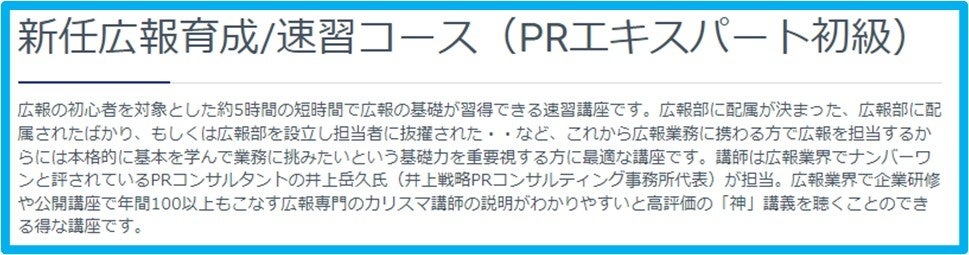日本広報教育センターは知識付与だけでなく結果の出せる広報パーソンの育成にこだわった広報パーソン育成の専門機関です。新任向け「新任広報育成講座 速習コース」をはじめ広報専門eラーニング講座を多く展開しております。