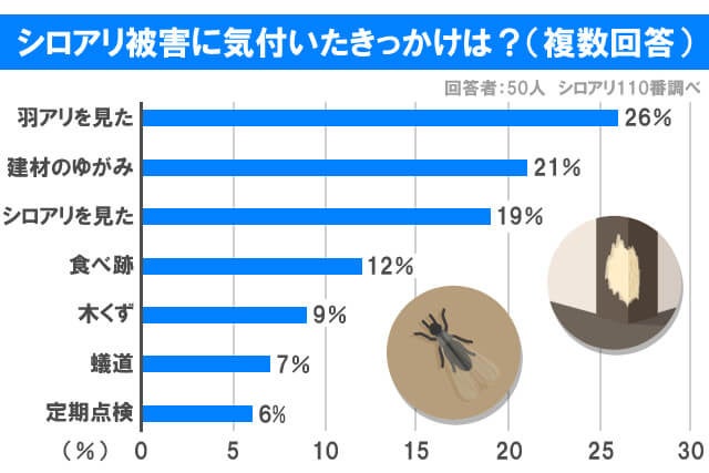 シロアリ被害に遭ったことがある方50人を対象におこなった当社の独自アンケート(2021年12月時点)によると、被害に気付いたきっかけの第1位は「羽アリ(死骸・残骸も含む)を見た」でした。