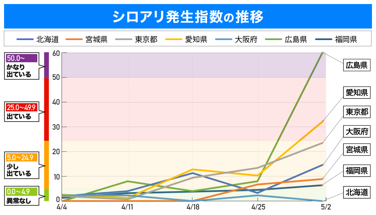 2023年4月4日より、毎週月曜日~金曜日に更新を続けてきた当サービスでは、以下の6県で発生レベルの最大領域である「かなり出ている」を確認しています。