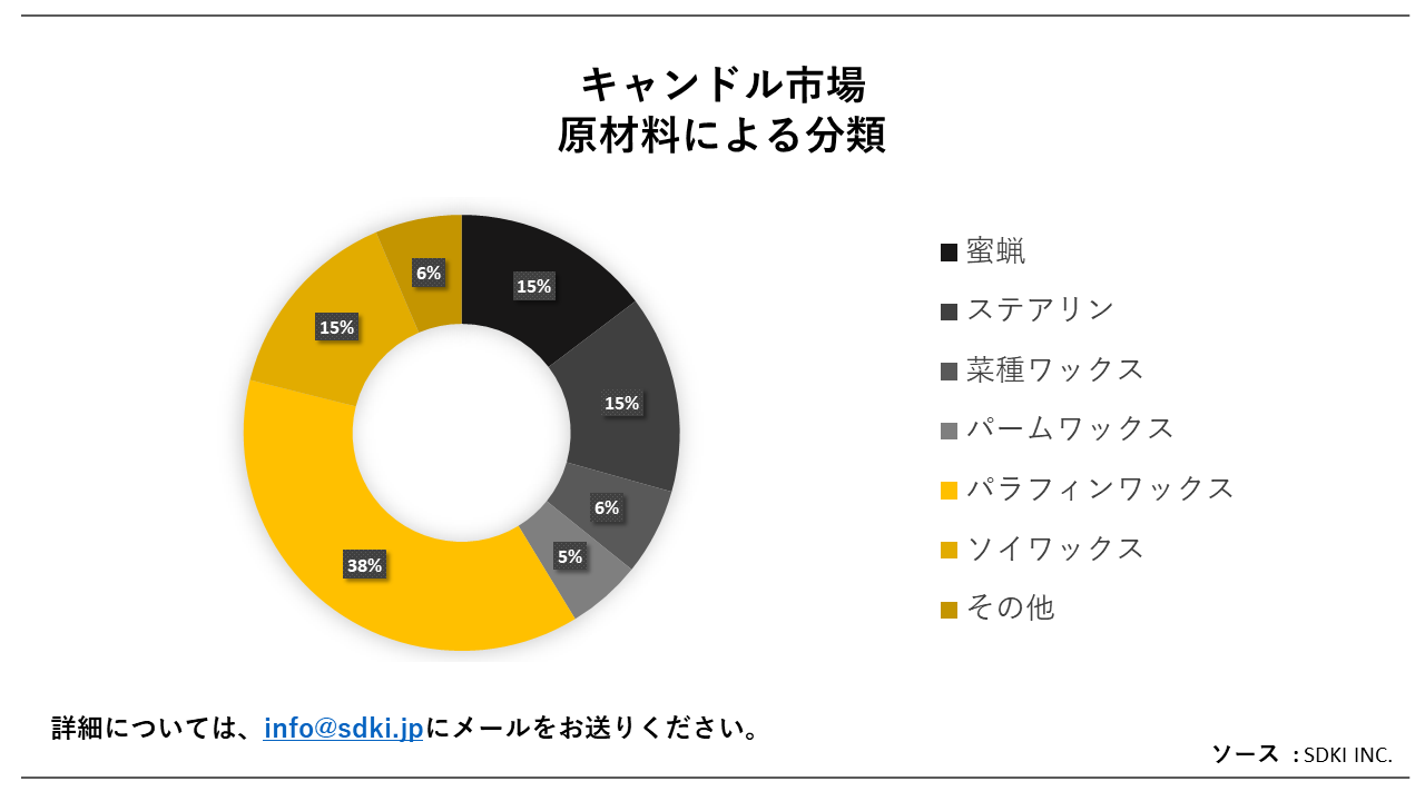 キャンドル市場は、原材料別、タイプ別に分類することができます。これらのセグメントは、次のようにさらに分岐します。
