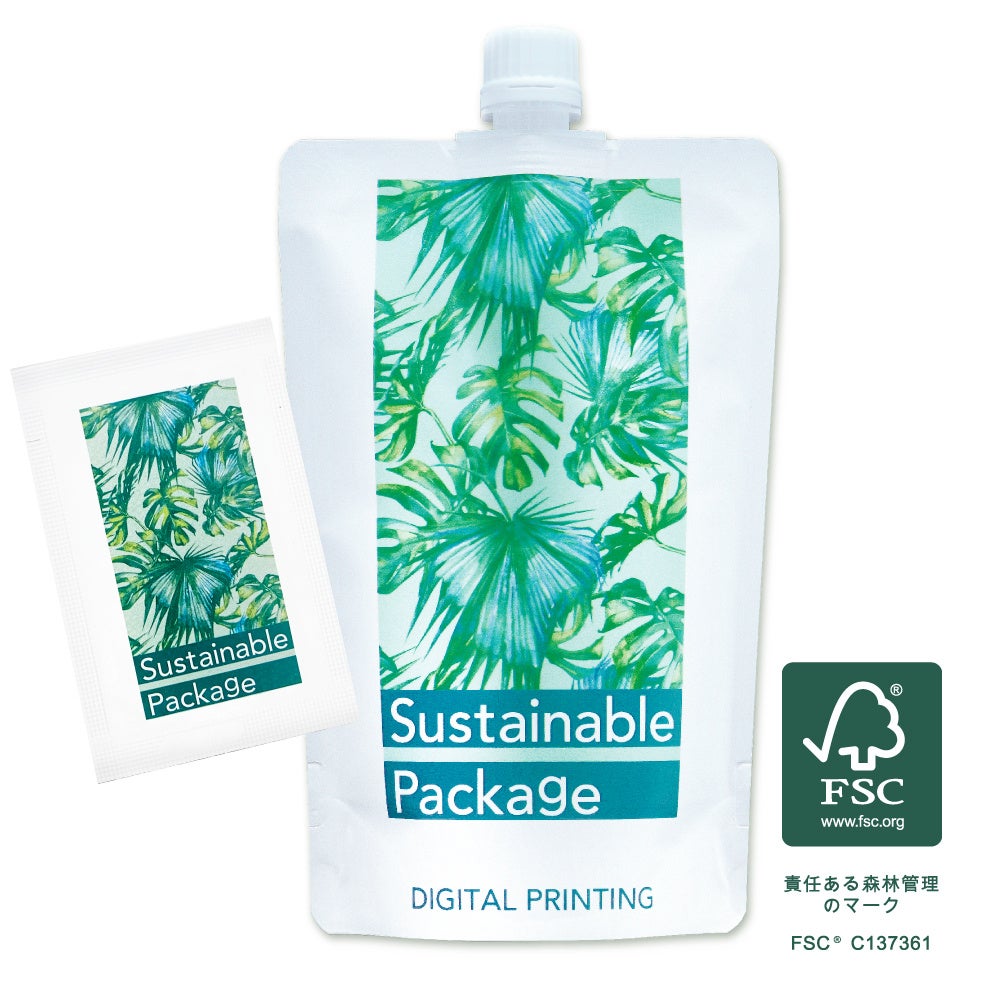 表面基材を従来のPETから紙に置き換えて、プラスチック使用量を削減した「減プラ」のスパウトパウチです。多品種少量向けにはデジタルインクジェット印刷、大量向けにはグラビア印刷で製造します。表面に抗菌ニス加工もできます。充填、アッセンブリも承ります。