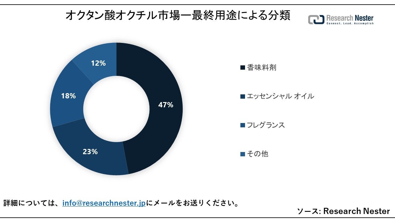 世界のオクタン酸オクチル市場は、エッセンシャル オイル、香味料剤、などへの最終用途別の需要と供給に対してセグメント化および分析されています。そのうち、香味料剤のセグメントは、世界のオクタン酸オクチル業界で最大のシェアを占めると予想されています。これは、製薬業界でチュアブル錠、シロップ、ガムの不活性成分としてフレーバーの使用が増えていることが原因であると考えられます。これとは別に、より多くの味を必要とするすぐに食べられる食品の需要の増加も、将来の市場セグメントの成長を後押しすると予測されています。2020 年の調査では、米国の消費者の 55% が、COVID-19 のパンデミック前と比較して、購入の利便性と時間の節約の要因により、より多くのパッケージ化された調理済み食品を食べるようになることがわかりました。