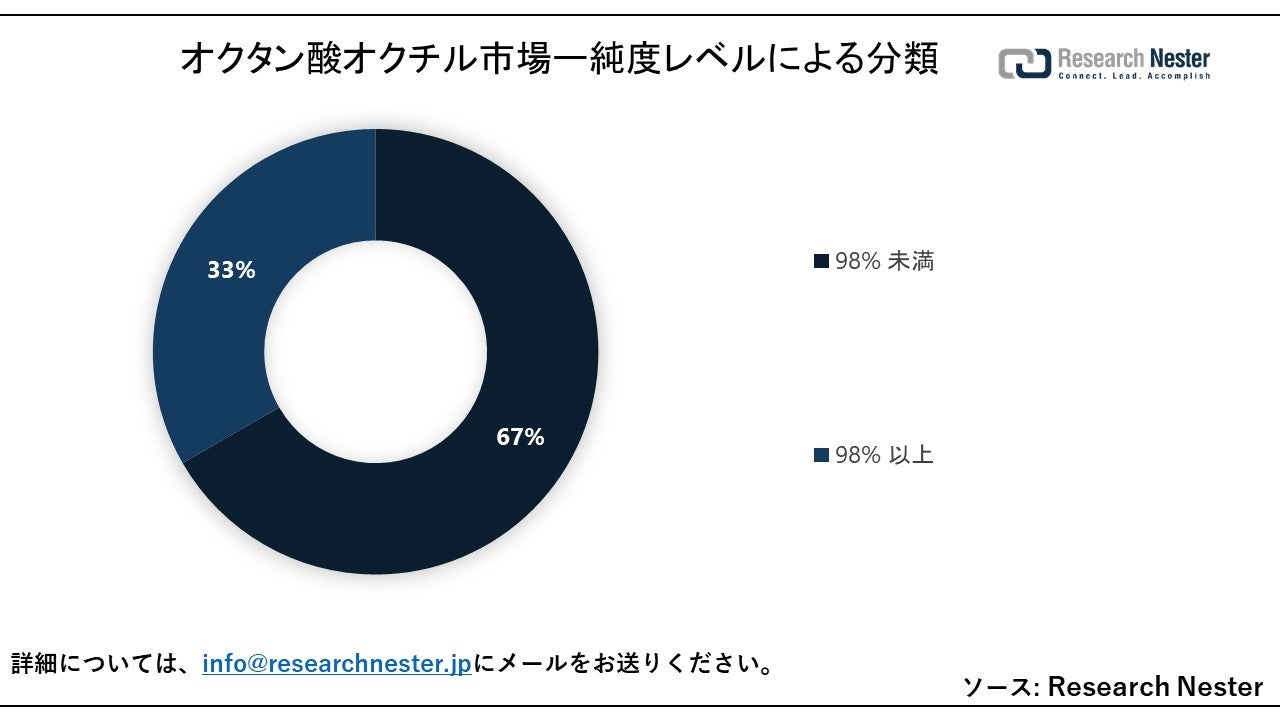 オクタン酸オクチルの世界市場は、98% 未満と 98% を超える純度レベルによって需要と供給を分割および分析されています。純度レベルに基づいて、98% 未満のセグメントが予測期間中に最大のシェアを占めると評価されます。このタイプのオクタン酸オクチルは入手可能性が高く、価格が安いため、さまざまな業界で広く使用されています。このセグメントの利用は、フレグランス、化粧品、製薬業界など、さまざまな業界で見られます。