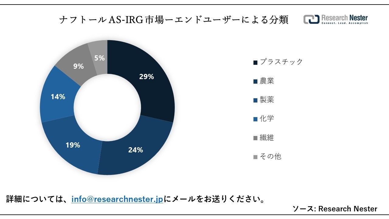 世界のナフトール AS-IRG 市場は、プラスチック、農業、製薬、化学、繊維などのエンドユーザーによる需要と供給についてもセグメント化および分析されています。これらのセグメントの中で、プラスチック セグメントは、2035 年に約 38% の大きなシェアを獲得すると予想されます。予測期間中のセグメントの成長の主な要因は、プラスチック生産の増加と、世界人口によるプラスチック製品の必要性の高まりです。経済協力開発機構による最新のレポートによると、2000 年から 2019 年までの世界のプラスチック生産量は、約 460百万トンに達したと推定されています。