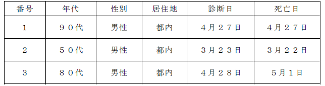 新型コロナウイルスに関連した患者の死亡について business Twitter Facebook はてブ Pocket LINE コピー 2023.05.06 この記事は約1分で読めます。 都内で新型コロナウイルスに感染した方が死亡されましたのでお知らせします。 お亡くなりになった方のご冥福をお祈り申し上げます。 1 新型コロナウイルスに関連した死亡者(本日公表分) ※ 患者・御家族の人権尊重・個人情報保護に御理解と御配慮をお願いします。 2 新型コロナウイルスに関連した死亡者の累計 8,120人