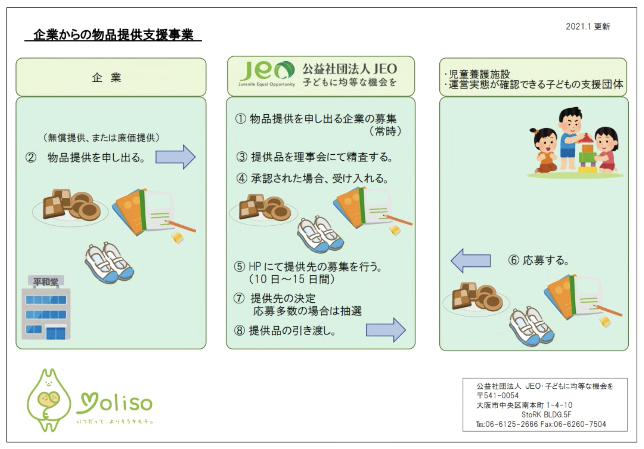 JEOでは、「企業からの提供品」を「それらを必要とする児童養護施設や子どもの支援団体へ」橋渡しをしています。