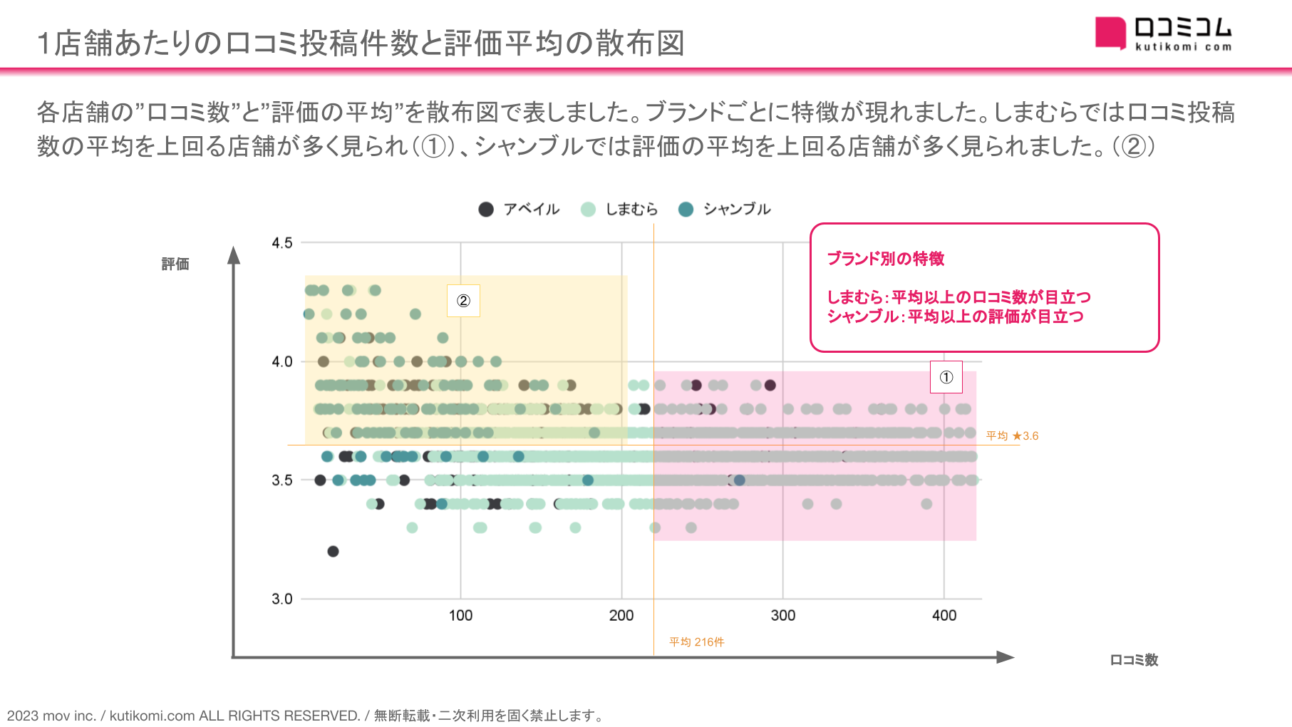 各店舗の”口コミ数”と”評価の平均”を散布図で表しました。ブランドごとに特徴が現れました。しまむらでは口コミ投稿数の平均を上回る店舗が多く見られ(①)、シャンブルでは評価の平均を上回る店舗が多く見られました。(②)