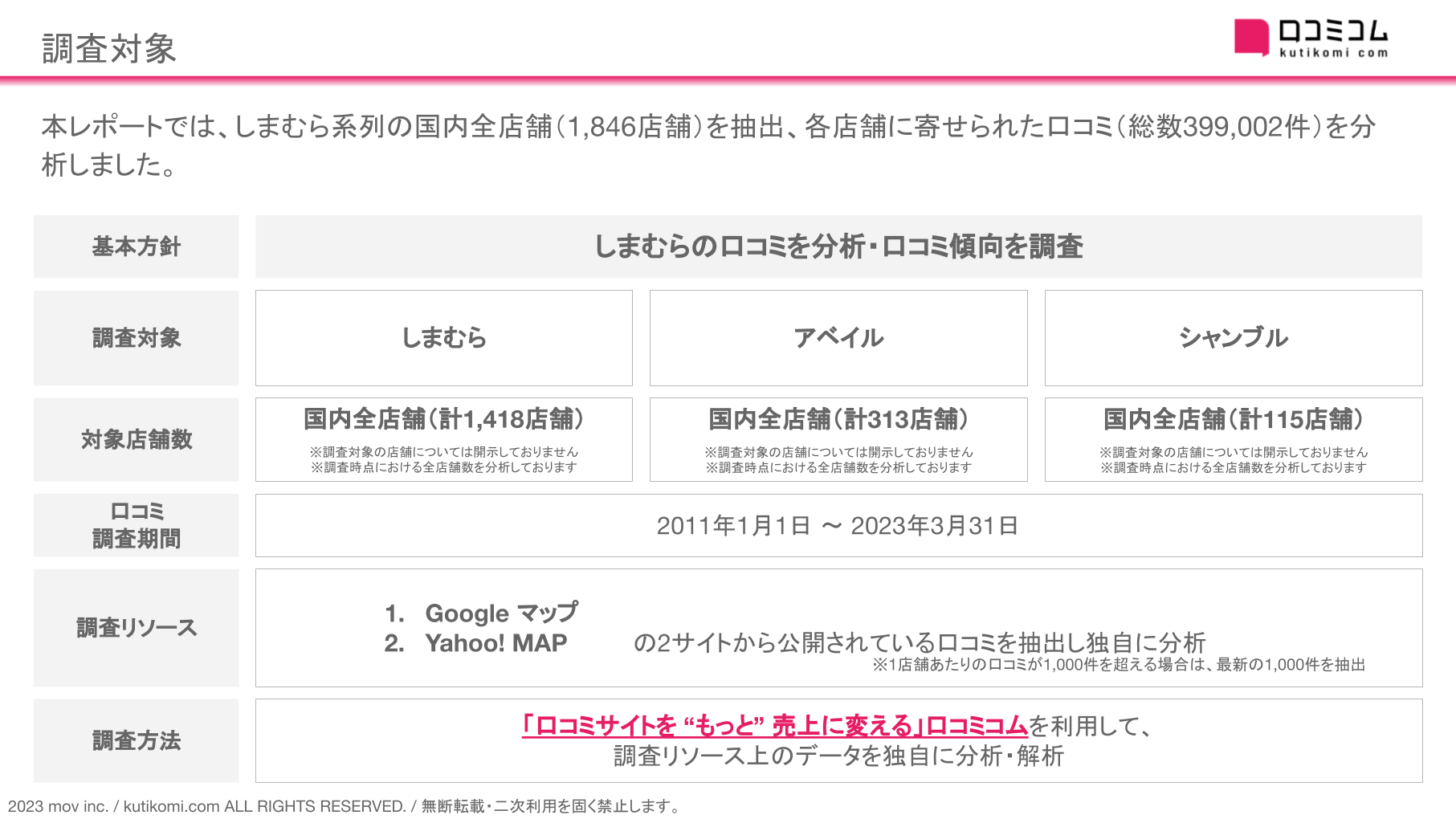 本レポートでは、しまむら系列の国内全店舗(1,846店舗)を抽出、各店舗に寄せられた口コミ(総数399,002件)を分析しました。