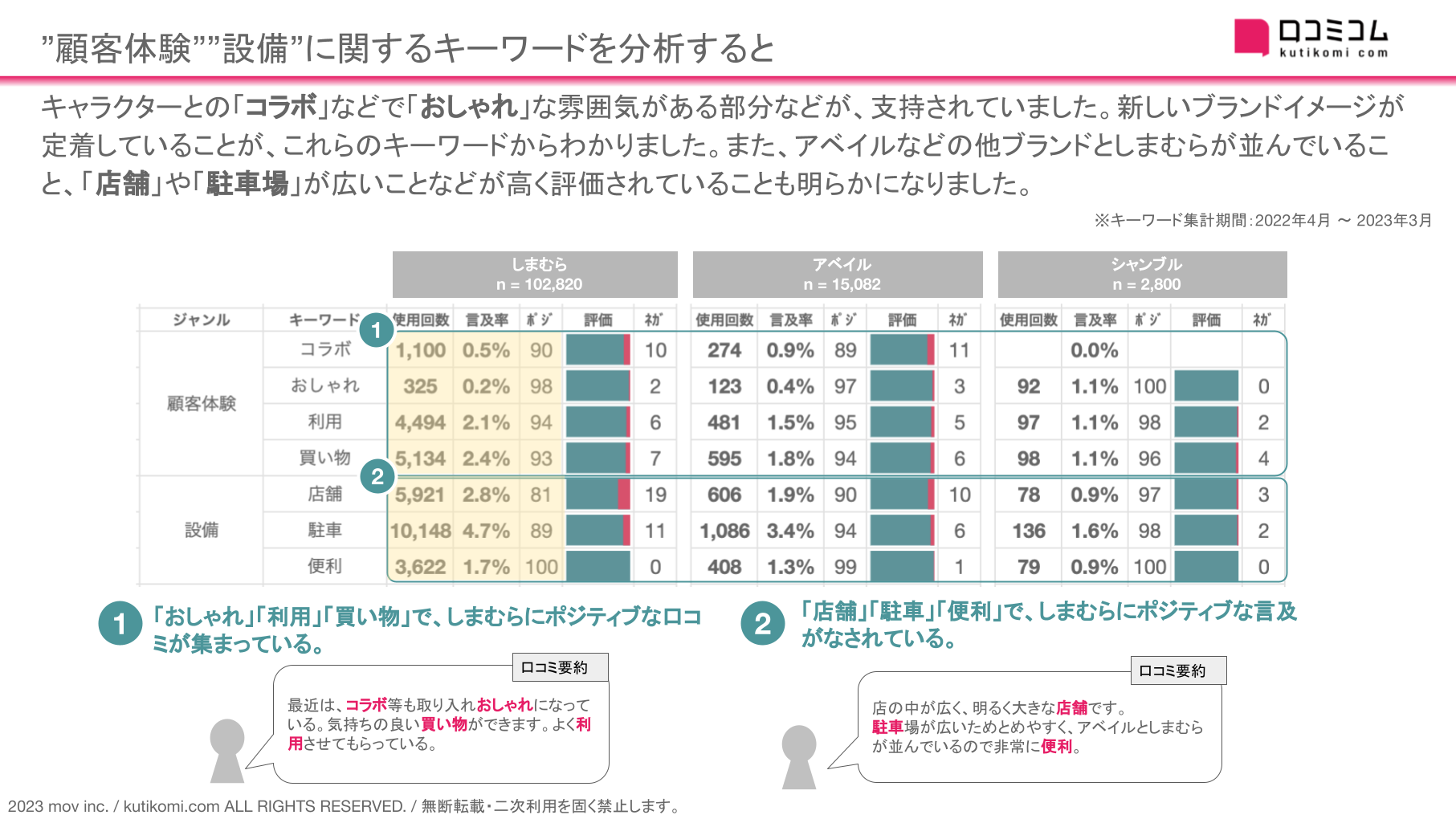キャラクターとの「コラボ」などで「おしゃれ」な雰囲気がある部分などが、支持されていました。新しいブランドイメージが定着していることが、これらのキーワードからわかりました。また、アベイルなどの他ブランドとしまむらが並んでいること、「店舗」や「駐車場」が広いことなどが高く評価されていることも明らかになりました。