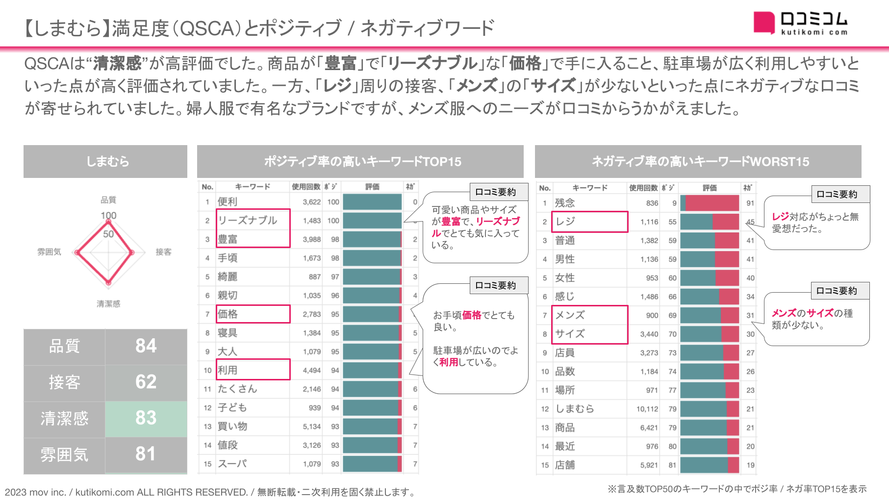 今回は、このAI解析を用いて【しまむら】のQSCA・ポジ / ネガキーワードを確認しました。