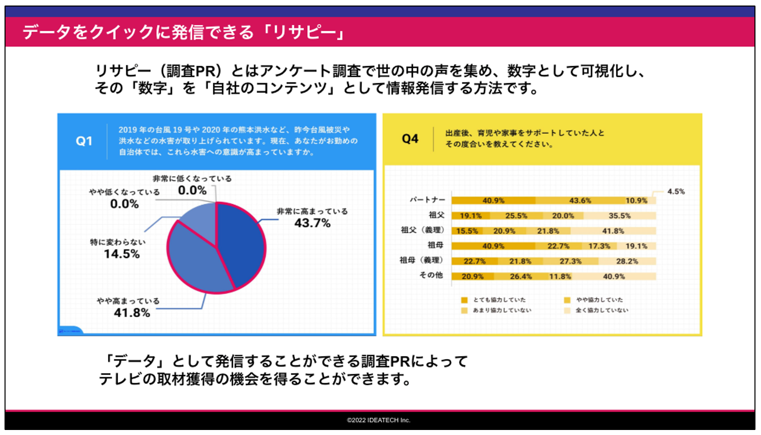 弊社は、クイックなアンケート調査で裏付けを取り、リサーチ結果をPRするワンストップサービスとして「リサピー®︎」を提供しています。その中で、100社を超える企業様のPR・マーケティング領域での「調査(リサーチ)」企画に携わり、マーケティング・PRとしての「調査(リサーチ)」の有効性を実感しております。