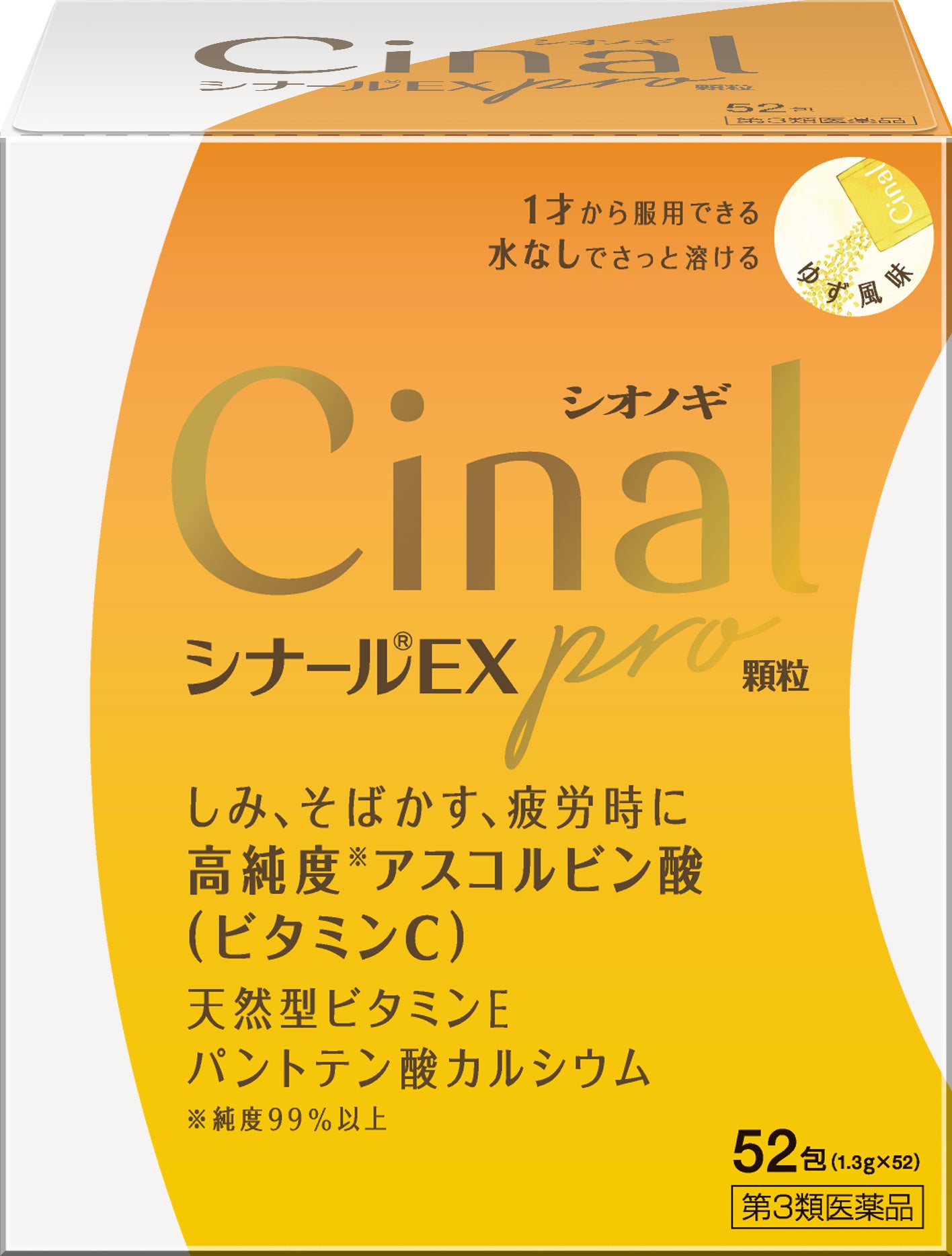 4種の有効成分※を、シナール史上最大量配合したビタミンC主薬製剤。純度99%以上の高純度ビタミンCが、肌細胞に直接アプローチします。やさしい甘みのゆず風味。水なしで口の中でさっと溶ける顆粒タイプです。シュガーフリーかつナトリウムフリーの製剤設計で、1歳から服用いただけます。