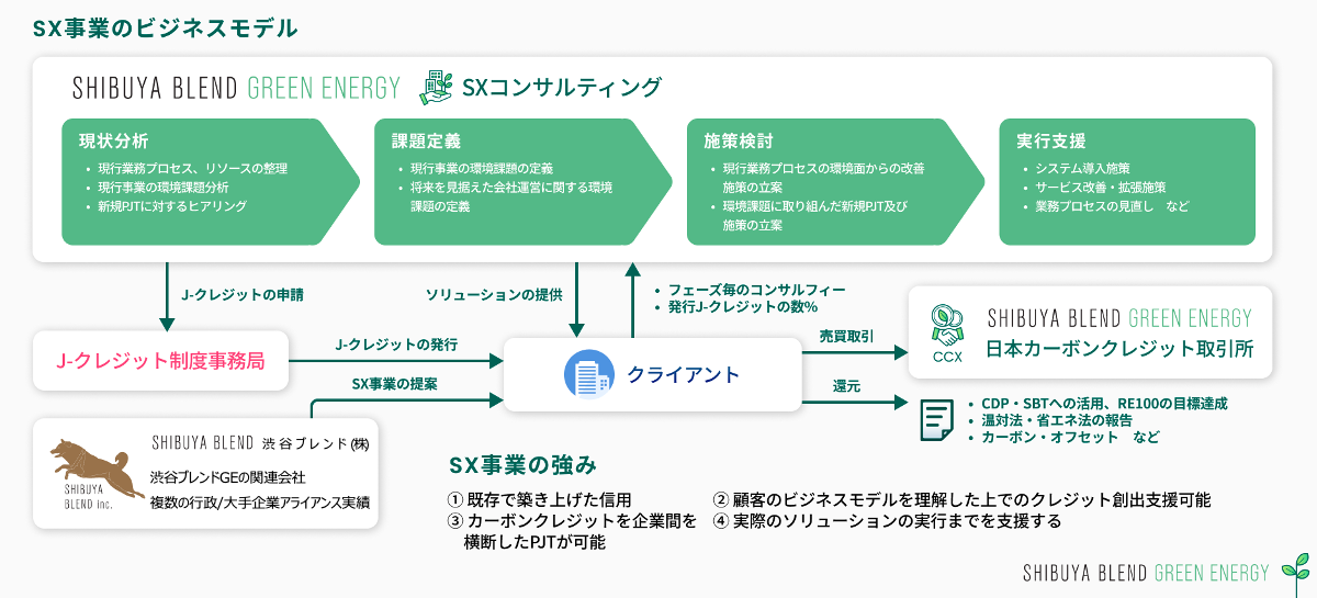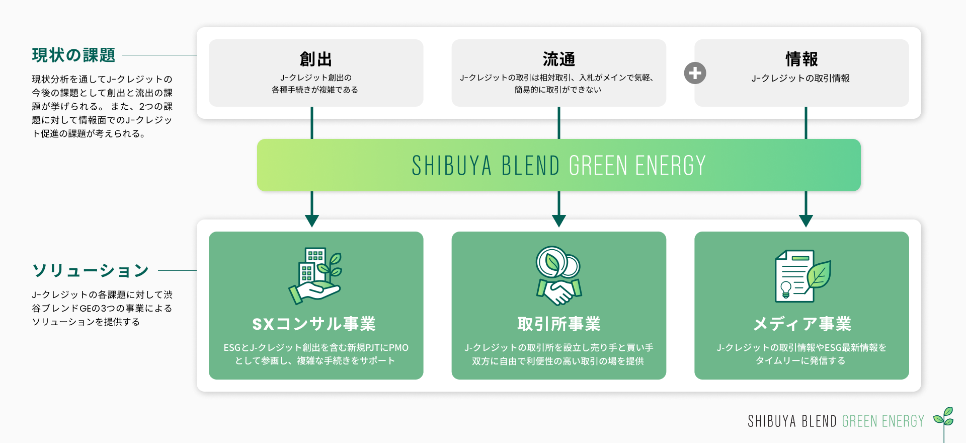 渋谷ブレンドGEは企業のESG活動の課題を解決する戦略や業務プロセスの策定を支援しソリューションを提供するSXコンサル事業とJ-クレジットの流通を支援するカーボンクレジット流通事業、注目度の高いサスティナビリティやJ-クレジットなど環境に関連する最新情報を発信するメディア事業を展開いたします。