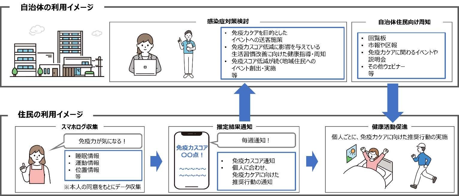2023年5月8日(月)より新型コロナウイルス感染症が5類に移行されることに伴い、各自治体や住民個人が自立的に感染症対策を行うことが重要になると予想されます。健康マイレージはこれまで健康増進や介護予防、地域包括ケア、マイナポータル利活用をはじめとしたDX推進など、さまざまな分野を横断したサービスを提供してきました。そのなかで自身の健康状態を推定し、フレイルリスク(※1)や平均余命のスコアリング、アドバイスを受け取ることで意識変容につなげていく仕組みを提供しており、あらたに免疫力の変化を推定・予測する「免疫力推定AI」を実装します。このように、包括的に住民の健康をサポートすることで、自治体の医療費・介護費削減への貢献をめざします。希望する自治体へは実証として免疫力推定AIの無償提供を予定しており、自治体の課題解決および住民の不安軽減へつなげます。