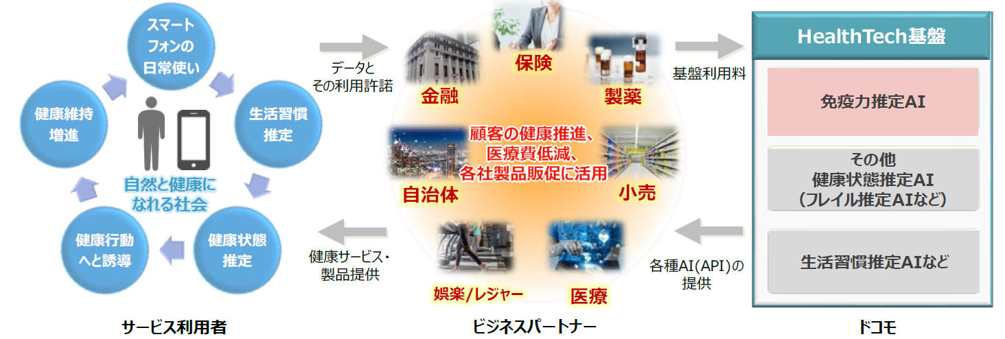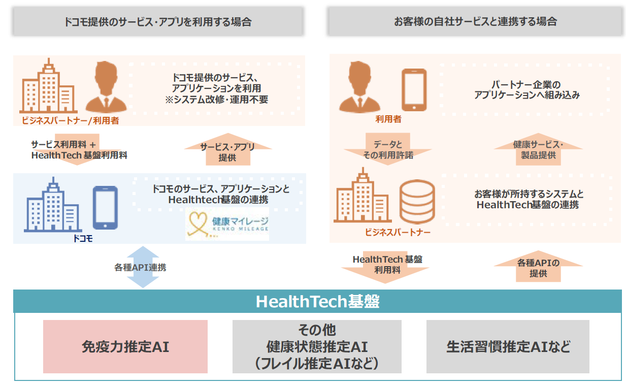 なお、免疫力推定AIは、ヘルスケアに関連したさまざまな健康状態や生活習慣などを推定するAIを集約した、ドコモが提供する「ヘルステック(HealthTech)基盤」に実装されます。また、免疫力推定AIをヘルステック基盤のAPIと連携し利用することも可能です。ヘルステック基盤の詳細は以下概要をご確認ください。