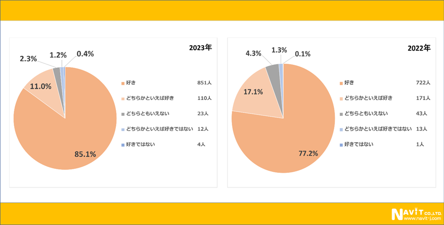 「どちらともいえない」が2.3%と前年(4.3%)と比べて2.0%ダウンしています。どちらかといえば好きのダウン幅と合わせると、好きの上昇幅とほぼ同じですね。