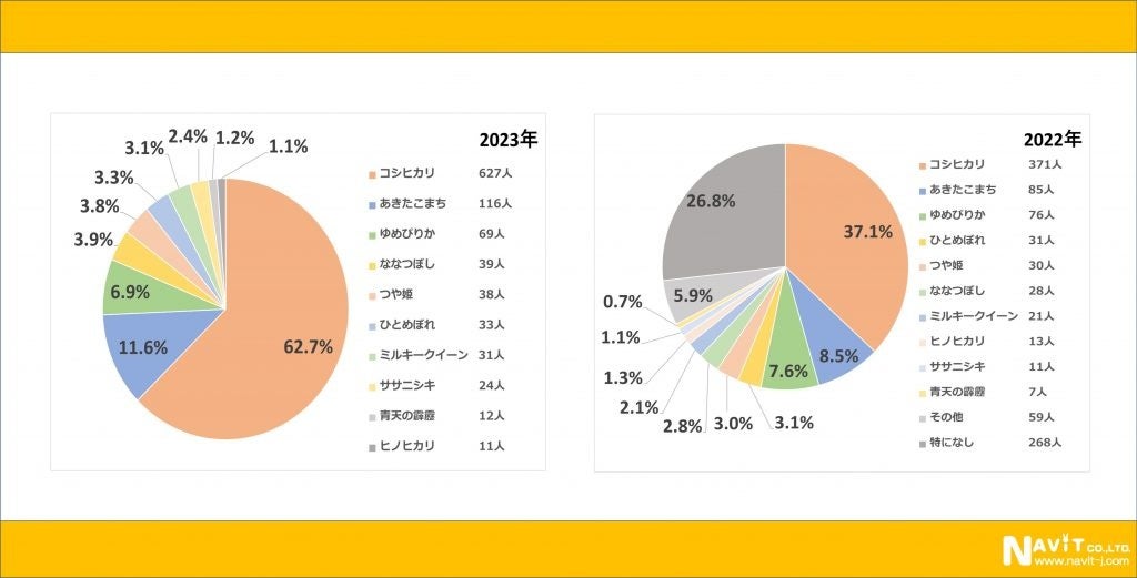 お米で好きなブランドは前年と同様に「コシヒカリ」が1位で62.7%となっています。去年の結果では37.1%だったので大幅にアップしています。続いて「あきたこまち」が11.6%と前年(8.5%)と比べ3.1%上昇しています。昨年の調査では「特になし」が26.8%だったのですが、今年の調査では「特になし」という項目がなかったので、その影響でコシヒカリが上がったのでしょうか。3番目に選ばれた銘柄は「ゆめぴりか」で6.9%となっています。