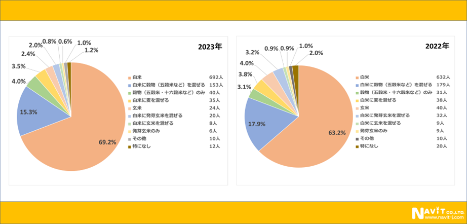 「一番好きなお米のタイプは何ですか?」という質問では、「白米」が69.2%と最も高く前年(63.2%)よりも6.0%アップしています。次に「白米に穀物(五穀米など)を混ぜる」15.3%が前年(17.9%)から2.6%ダウンで、前年に入っていなかった「穀物(五穀米・十六穀米など)のみ」が4.0%となっています。前年では3位であった「玄米」2.4%は前年(4.0%)と比べて1.6%ダウンとなっています。