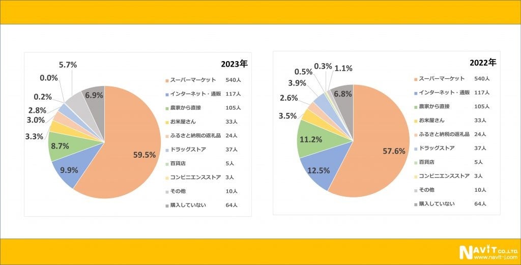 お米を買う時は昨年の調査に引き続き「スーパーマーケット」で59.5%と1番多く前年の54.0%から5.5%上昇しています。アフターコロナでスーパーマーケットに買い物に行く人が増えた影響かもしれません。続いて「インターネット・通販」で購入する方が9.9%と前年(12.5%)と比べると2.6%減っています。そして「農家から直接」が8.7%とこちらも昨年(11.2%)から2.5%減少しています。やはりスーパーなどで色々と見て購入したいという心理の現れかもしれませんね。