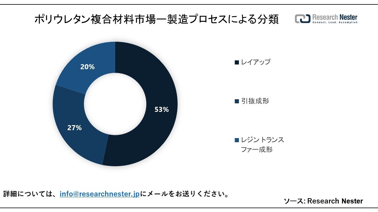 世界のポリウレタン複合材料市場は、レイアップ、引抜成形、および樹脂トランスファー成形への製造プロセスによって、需要と供給についても分割および分析されています。これら 3 つのセグメントの中で、レイアップ セグメントは大きなシェアを獲得すると予想されます。この成長は、この製造プロセスの処理の容易さと低コストに起因する可能性があります。さらに、この方法では、片面金型を使用して、繊維強化材の各層を液体樹脂に浸します。その結果、今後数年間でこのセグメントの成長のための多くの機会が生まれると予想されます。
