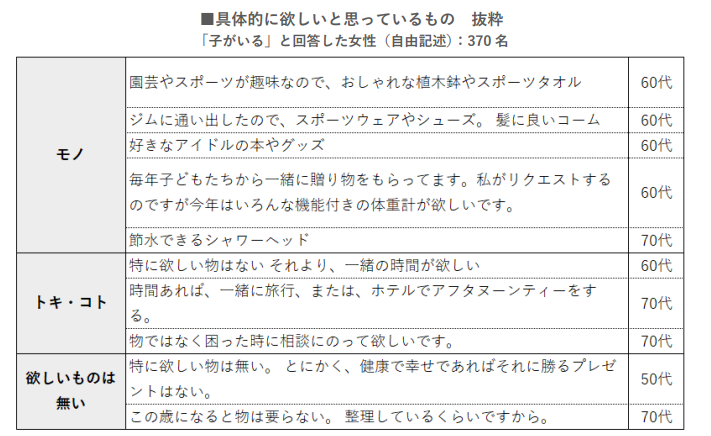 ・欲しいものの自由記述では、「スポーツウェア」「アイドルのグッズ」など趣味のものや「体重計」「シャワーヘッド」などの生活用品が多く挙った一方で、「一緒の時間」「相談にのって欲しい」など、モノ以外のリクエストも多かった。