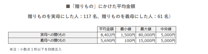 母の日の贈りものにかけた平均金額は、実母が8,402円、義母が5,690円